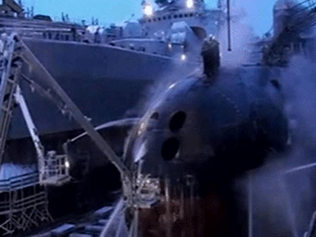 Пожар на подлодке, стоявшей в 50-м спецплавдоке 82-го судоремонтного завода в поселке Росляково, вспыхнул 29 декабря и был окончательно ликвидирован только через 20 часов. По предварительной версии следствия, огонь возник во время проведения работ с автогеном - из-за искры воспламенились деревянные строительные леса, смонтированные вокруг подлодки. Возгорание перекинулось на легкий внешний корпус со специальным резиновым противогидролокационным покрытием.