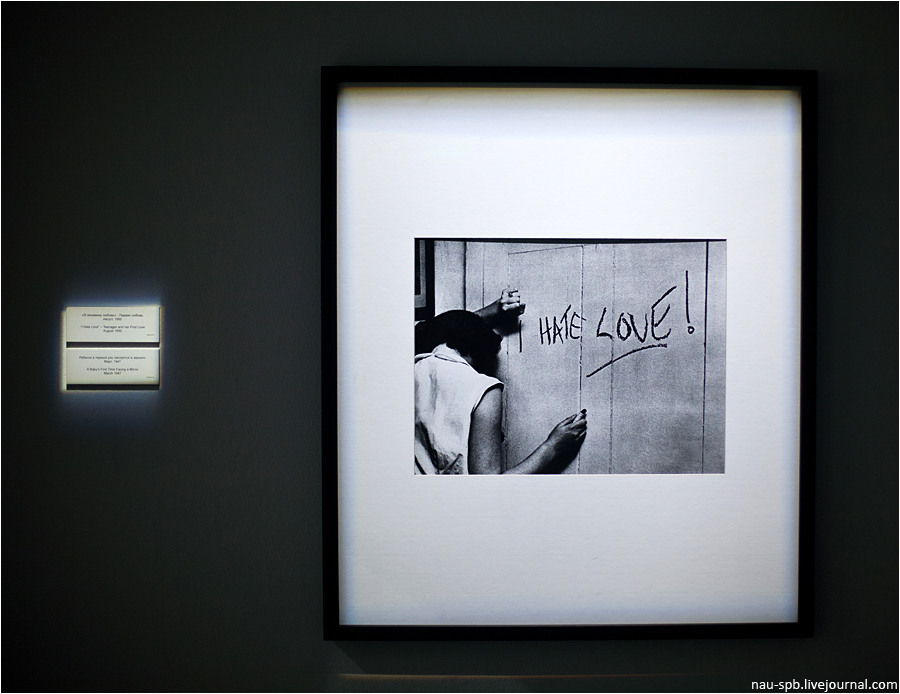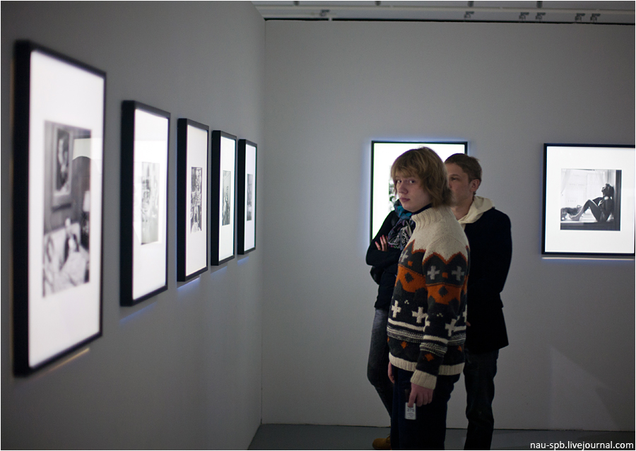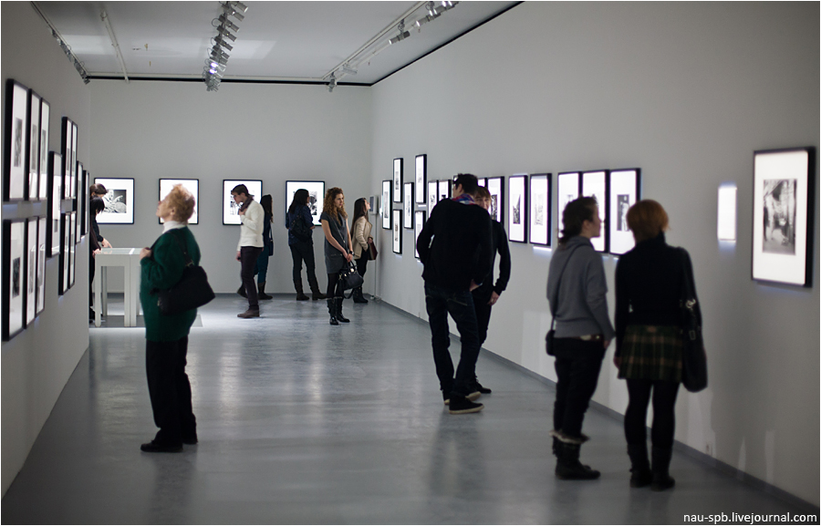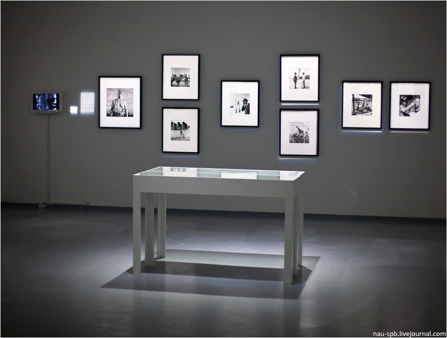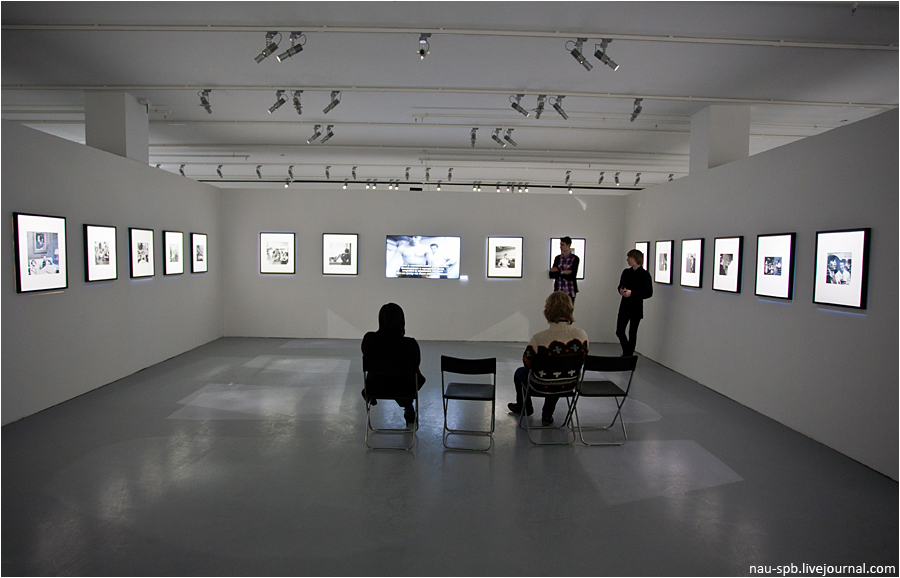 4. Пару слов об освещении фотографий. У нас я такой техники не видел нигде. Войдя в зал, мне сначала показалось что фотографии освещаются как бы изнутри светом, но потом я подумал что это невозможно. Затем поднял голову наверх, и увидел что для каждого снимки сверху проецируется луч света. Это гениально и удобно! Нет бликов, отражения самого себя и все отлично видно. Отличная идея с освещением, надеюсь что и в наших галереях до такого когда-нибудь дойдут.