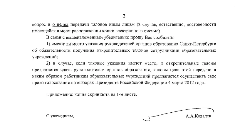 «Уважаемые руководители! Всем сотрудникам, прописанным не на Васильевском острове, с 18.01 по 21.01 необходимо получить открепительный талон в ТИК своего района (список прилагается) и сдать вам. В понедельник, 23 января, список вышеуказанных сотрудников в бумажном и электронном виде вместе с открепительными талонами сдать в отдел образования».