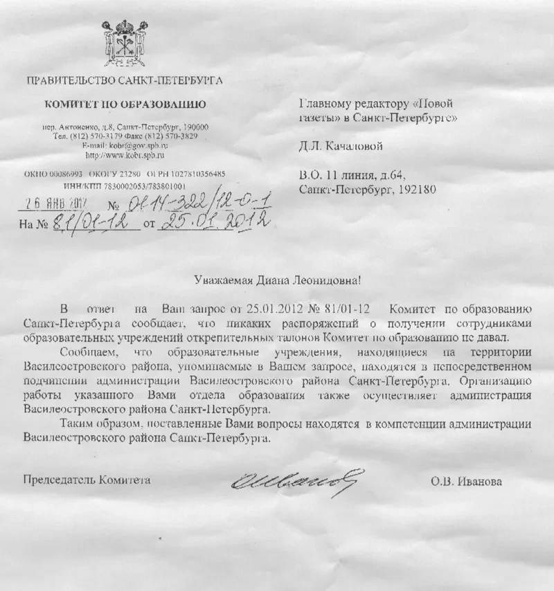 СМ. ДОКУМЕНТ – ОТВЕТ на запрос «Новой газеты» от председателя Комитета образования Петербурга Ольги Ивановой.
