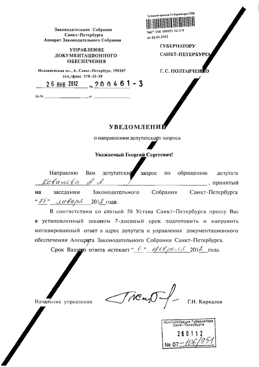 2 февраля градоначальник (Полтавченко) ответил парламентарию (Ковалеву):