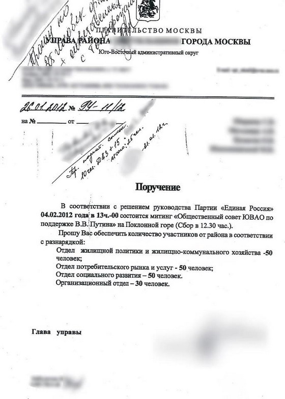 Интересный документ выложил на свою страничку в Фейсбуке один из сторудников госструктуры. В тексте официального письма, спущенного в кабинет управы района прямо из столичной администрации, настоятельно "просили" обеспечить присутсвие на путинском митинге к часу дня 4 февряля на Поклонной горе в общей сложности 180 сотрудников разных административных отделов (подробнее - на скане документа).