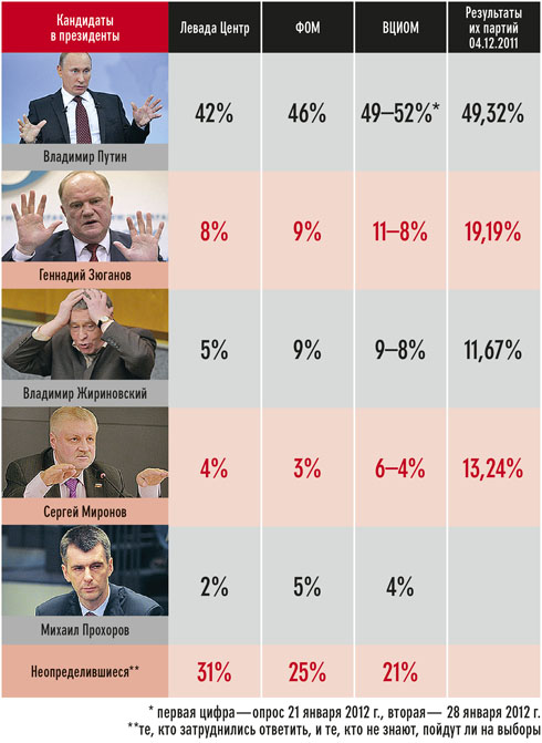 Вряд ли когда-нибудь мы узнаем, сколько набрали бы КПРФ и «Справедливая Россия» на парламентских выборах, если бы за них не проголосовали рациональные избиратели, движимые одним мотивом: черт с ним, что написано на знаменах партий, главное — не отдать свой голос «Единой России». (Нерациональные избиратели голосовали «против всех» или за «Яблоко», в результате при пересчете их голоса ушли все тем же «жуликам и ворам»). И тем не менее, сопоставляя итоговые результаты парламентской кампании и нынешние рейтинги их лидеров, видны разительные отличия. Например, КПРФ набрала 4 декабря 19,19%, хотя летом до начала активной фазы парламентской кампании ее рейтинг держался в пределах 10–13%, а нынешний рейтинг ее лидера Геннадия Зюганова, по данным трех основных социологических служб, колеблется от 8% («Левада-Центр») до 11% (ВЦИОМ). Еще страннее выглядят сопоставления результатов «Справедливой России» (13,24% по итогам парламентской кампании) с нынешним рейтингом кандидата в президенты Сергея Миронова — 3–5%. Единственный, кто держится в своем «коридоре», это Владимир Жириновский, чьи взгляды неопределимы и за кого голосуют «по приколу», то есть не включая головы: 11,67% — 4 декабря, 9% — на конец января. Резонно предположить, что в разнице между декабрьскими и нынешними рейтингами и «сидит» протестный электорат.