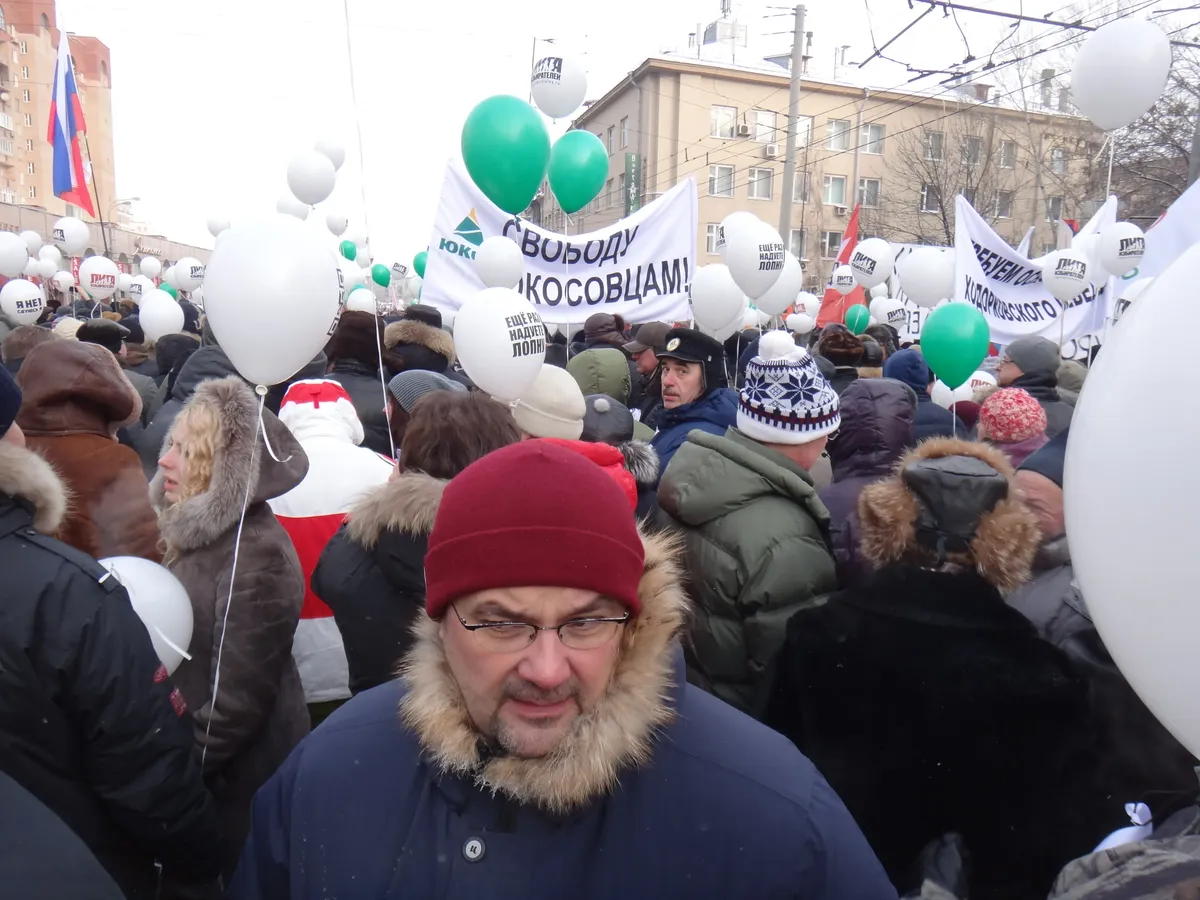 Это было как-то волнами. За старыми большевиками с плакатом шли растаманы с кисточками, за пожилым московским евреем — очень юный русский неофашист. Рядом с нами стоял человек в черном (между прочим, тоже в очках), который все время вполголоса повторял одно и то же слово. Например, с трибуны спрашивали: «Кто украл наши голоса?» — и он отвечал: «Жиды». Трибуна явно ждала не такого ответа, но этот парень и не был провокатором, он повторял слово не громко, а тихо своему соседу, чтобы никого не обидеть вслух.