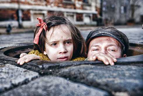 Зрителя ждет нелегкий опыт: ему предстоит войти в подземелье и два с половиной часа задыхаться вместе с героями. Там, под землей, жизнь — одна из узниц рожает мальчика. Прямо под костелом, где распевают молитвы во славу другого еврейского мальчика, распятого на кресте… Соха потрясен. Он приходит домой и рассказывает жене о своих евреях, о младенце, родившемся там, где и жить-то нельзя. И жена раздумывает: «Евреи…» — «А что евреи? — перебивает Леопольд. — Наша Богородица тоже еврейка!» Жена немеет от этой новости — и решает взять ребенка. Мальчика, сына, о котором мечтал Соха: «Скажу, что сестра родила и уехала, оставила нам…» Когда же Соха спустится в канализацию, окажется, что женщина задушила своего младенца, чтобы он плачем не выдал схрон и не погубил всех… „