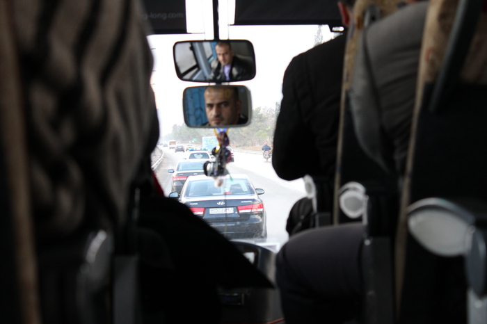 Затем мы загрузились в автобус и направились в гостиницу. Впереди ехало две "Хёндаи" спецслужб и авто с мигалкой. Сзади примерно также. Сначала это казалось необычным, но за последующую неделю я абсолютно привык к сиренам и крякалкам). Кстати, обратите внимание на отражение водителя. Внушает страх и уважение).