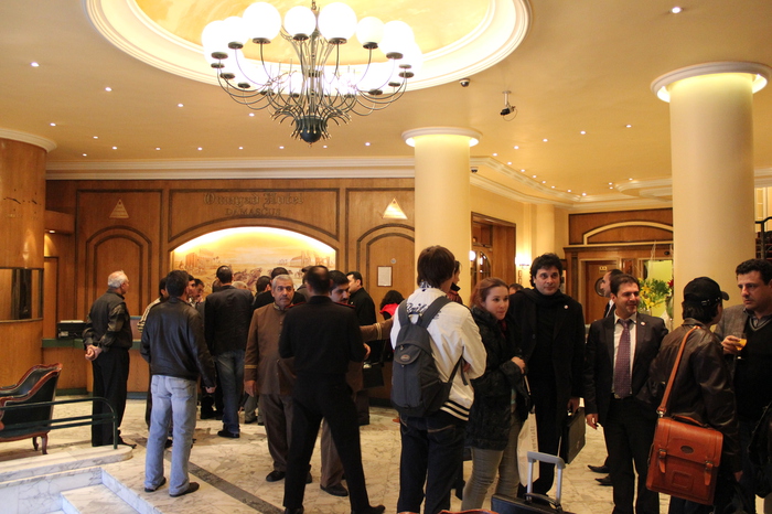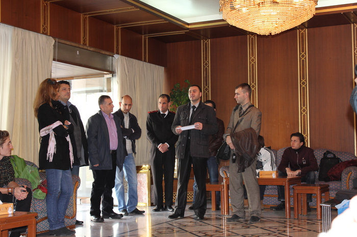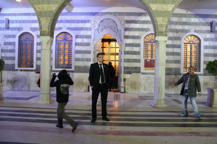 После мангового сока началась небольшая официальная часть. Третий слева мужчина (в фиолетовой рубашке) оказался руководителем Сирийского Союза студентов. В целом, это очень влиятельная структура, похожая на советский ВЛКСМ. Человек в черном галстуке и с бумагами в руках - Наваф Ибрагим. Он представляет союз студентов в России. Наваф по большому счёту был нашим главным гидом, переводчиком, организатором и вообще КРОСАВЧЕГОМ! Человек реально в течение недели спал по 3-4 часа в день, лишь бы всё в нашем визите сложилось как надо.
