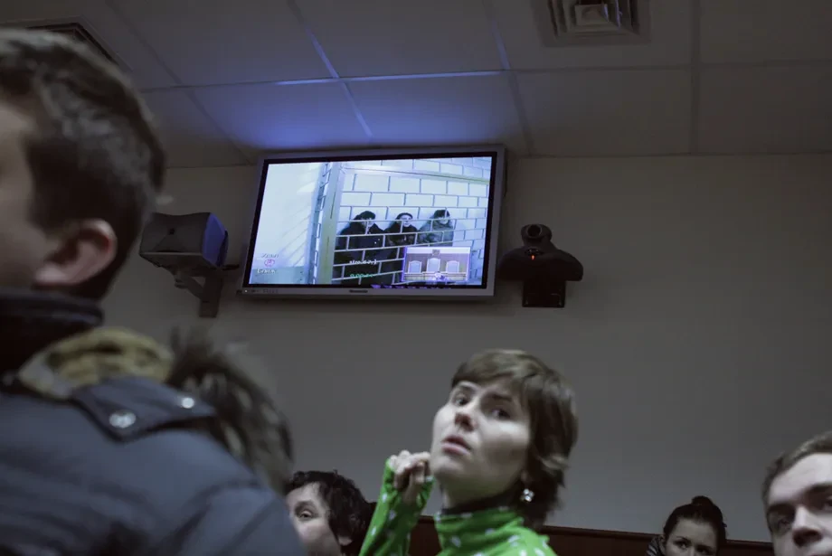 В 9.30 заходят трое судей — Безыкорнова, Румянцева и Елизаров. На экранах появляется картинка: кислотно-голубые стены, решетка — за ней трое женщин, одна из них Осипова. Камера снимает для них только судей, они не видят всех собравшихся.