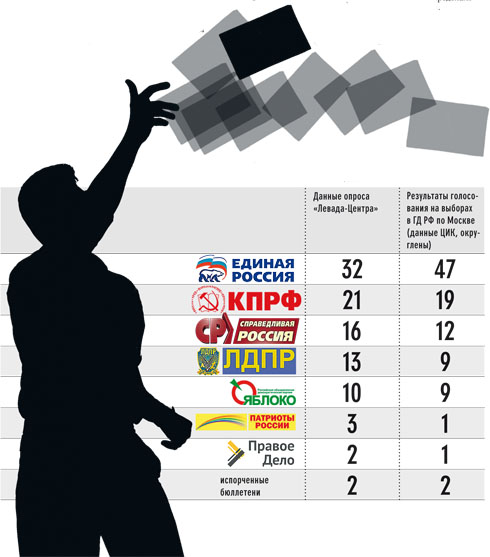 Схожие цифры получили и социологи «Левада-Центра», спустя неделю после дня голосования задавшие москвичам вопрос: «Голосовали ли вы на выборах депутатов Государственной думы и если да, то за какую партию?»4