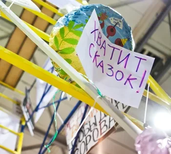 За каждой работой — своя история. Первое, что видишь, входя в зал, — огромный баннер «Сильному обществу лидер не нужен», который несла одна из колонн на шествии 4 февраля. Ниже три плаката: «Судья Москаленко служит сатане», «Череп и кости» и «Свобода». В подписи сказано, что авторы — арестанты камеры номер пять, спецприемника. Петр Верзилов, арестант камеры номер пять, вспоминает, что отбывал административный арест, который он и еще несколько десятков протестующих получили после демонстрации на Чистых прудах 5 декабря, заняться было нечем, и они таким образом поднимали себе настроение. Краску готовили сложным способом: разогревали и выдували пасту из ручек, смешивали ее с зубной пастой и рисовали на казенных простынях. Во время акции на Болотной площади арестанты спецприемника вывешивали свое творчество в окна камер, чем вызывали большое неудовольствие администрации. Баннер со словом «Свобода» даже пострадал, подкравшийся к окнам полицейский попытался его вырвать из рук, но стражу порядка достался только небольшой лоскут простыни.