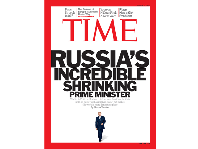 В сопровождающей снимок надписи буквами, набранными в каждой следующей строчке все более мелким шрифтом, выражается уверенность в победе Путина в выборах, но содержится и тревожное предупреждение. Заголовок гласит: "Невероятно уменьшающийся премьер-министр России" (Russia's Incredible Shrinking Prime Minister - выражение совершенно очевидно отсылает к американскому фантастическому фильму 1950-х годов Джека Арнольда "Невероятно уменьшающийся человек", в котором герой под воздействием инсектицида и радиации стремительно теряет в размерах). "Владимир Путин станет президентом на третий срок, но его власть ослаблена как никогда раньше. И от этого весь мир становится более опасным местом", - также говорится там.