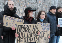 В Москве у спецприемника на Симферопольском бульваре задержаны пятеро участников пикета в поддержку Татьяны Стецуры, осужденной на 10 суток за акцию у ЦИКа и объявившей голодовку. Задержанные пикетчики доставлены в ОВД "Нагорный", они отказались представляться полицейским. По данным Граней.Ру, это Надежда Низовкина, Вера Лаврешина, Павел Шехтман, Геннадий Строганов и Дмитрий Смирнов (