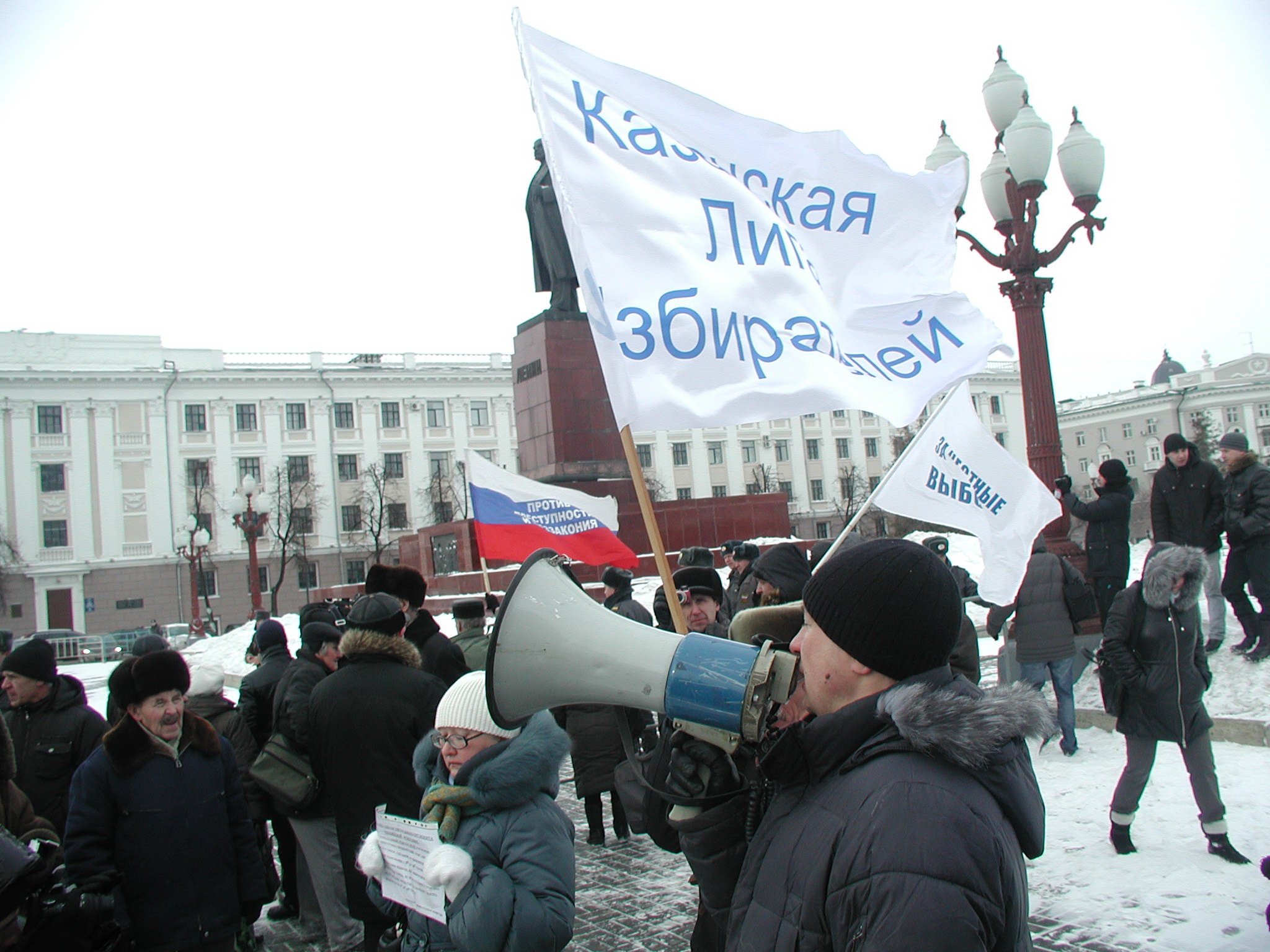 К 13 часам площадь освободилась, и сюда пришли два десятка граждан с флагами Казанской лиги избирателей. Полицейские предупредили пришедших, что их акция «За честные выборы» не согласована с городскими властями. Организатор акции, известный в городе правозащитник Дмитрий Бердников, предъявил документы, подтверждающие, что заявка была надлежащим образом оформлена и своевременно подана. Однако ему дали пять минут на то, чтобы свернуть флаги и освободить площадь.