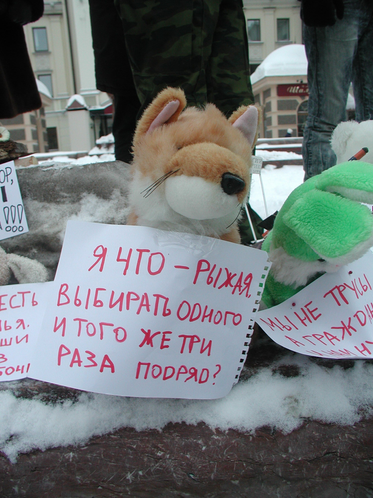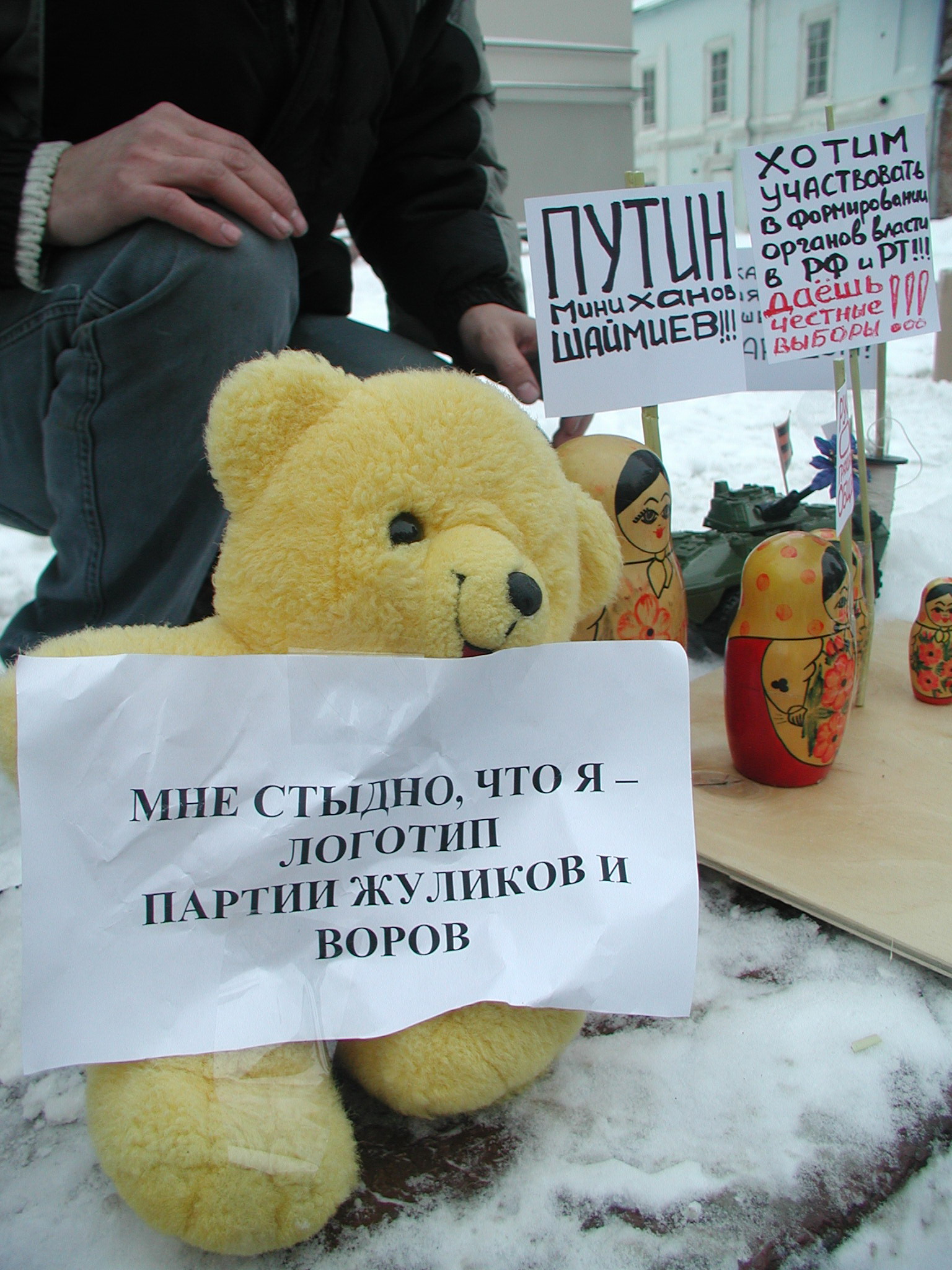 Тем временем на центральной улице Баумана проходил пикет «Игрушки – за честные выборы». Его участники, проявив немалую фантазию, выставили на обозрение прохожим детские игрушки, с забавными плакатиками. Так, плюшевый кот вопрошал: «Если не Путин, то кот?». Лиса возмущалась: «Я что – рыжая, выбирать одного и того же три раза подряд?». Медвежонок с грустью жаловался: «Мне стыдно, что я – логотип партии жуликов и воров». А заяц решительно заявлял: «Будут фальсификации – уйду в лес, в партизаны!»