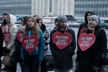 Ближе к Парку культуры замечаю людей с красными сердцами «Путин любит всех». К офису РИА «Новости» подъезжает несколько газелей, из них высыпают ребята с табличками: «Неделя до победы Путина». Кричат: «У вас несанкционированная акция!», «Только Путин, только победа!». Сначала пытаются выстроиться в параллельное кольцо, потом вдруг начинают движение в сторону «Октябрьской»...