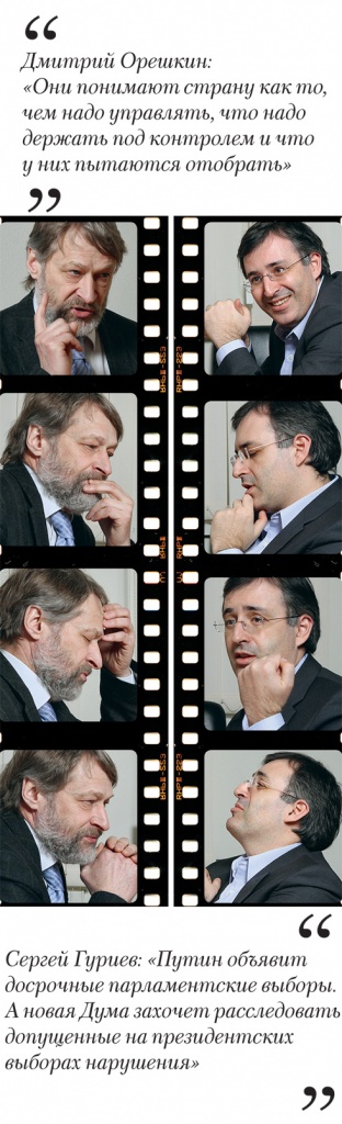 Как будет развиваться ситуация после 4 марта? Интернет и СМИ обсуждают три варианта сценария. Инерционный: все будет как было. Реформистский: Путин, понимая, что общество после 4 декабря изменилось, пойдет на политические и экономические реформы. Жуткий: «коллективный Путин» наелся плюрализма и закрутит гайки. О политическом будущем страны в редакции спорили политолог Дмитрий Орешкин и экономист, ректор Российской экономической школы Сергей Гуриев Сторонником какого сценария является каждый из вас? Дмитрий Орешкин: Я между инерционным и жутким.