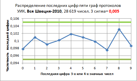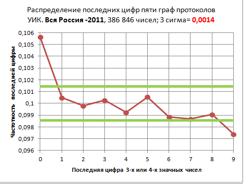 Разница не может не удивлять. На графике точки далеко вылезают из «зеленого коридора». Количество нулей среди последних цифр в России неправдоподобно велико, они встречаются много чаще, чем разрешает «три сигма». Да что там жалкие «три сигма», если такого не разрешают и 10 сигм! Вероятность, что такой результат получился совершенно случайно, описывается дробью, в знаменателе которой число большее, чем масса Земли в граммах (1027). А вот девятки встречаются почти столь же неправдоподобно редко. Даже семерки оказываются «нелюбимым» числом, всего лишь в 0,3% случаев такое может получиться случайно.