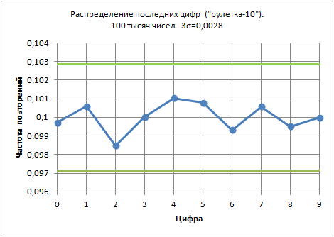 Вот, что получится, если не 100, а сто тысяч раз закрутить рулетку с 10 цифрами.