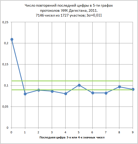 Разница уже не шесть, а 36 сигм! (Да и без всякой математики понятно, что если в нашей рулетке из 10 цифр сто раз из ста выпала одна и та же цифра, то рулетка явно мошенническая, а ведь тут разница лишь 11 сигма, а не 36). Только «5» пользуется некоторым преимуществом перед остальными цифрами, и лишь три из десяти цифр остаются в «зеленом коридоре». (Обратите внимание на то, что масштаб для Дагестана пришлось брать много мельче – иначе числа просто не умещаются)