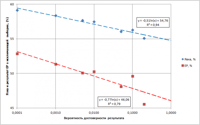 Теперь можно последовательно выключать из подсчетов результата голосования регионы, в которых вероятность, вычисленная по χ2,слишком мала, и смотреть на итоги. Ведь если преобладание нулей и недостаток единиц и девяток есть результат лишь маленького, простого и невинного округления, то на явке и результатах голосования это не должно сказаться, не правда ли?