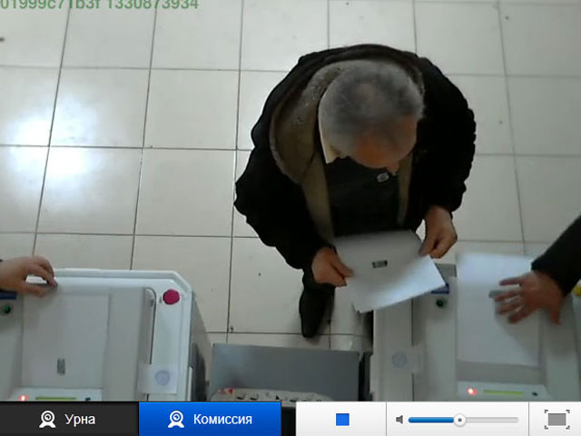 На трансляции с одной камеры хорошо видно, как пачки бюллетеней выдают прямо у столов комиссии. А другая камера, направленная на урны, ясно показывает, как их старательно запихивают в автоматизированные урны - КОИБы. У одного мужчины это выходит лучше - бюллетени "съедаются" один за другим, а соседний КОИБ иногда отказывается. Но, проявляя настойчивость, подобно президенту России, со второго раза он заставляет КОИБ принять бюллетень. Затем мужчины отходят, а на их место заступают другие - с новыми пачками бюллетеней.