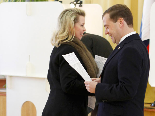 Президент России Дмитрий Медведев и его супруга Светлана проголосовали на выборах главы государства на избирательном участке номер 2634 в здании московской школы номер 1118.