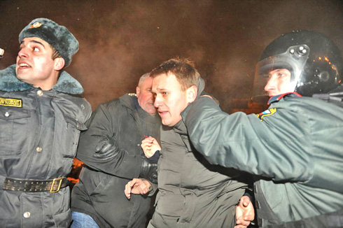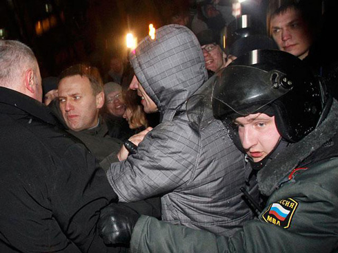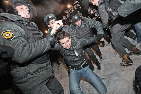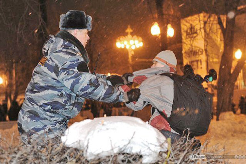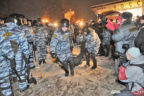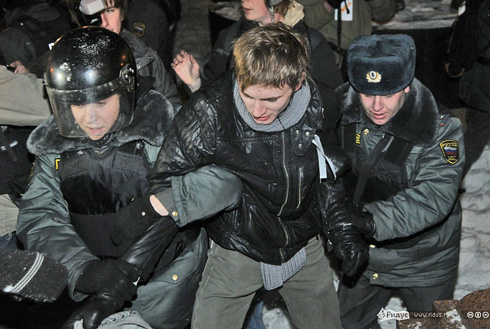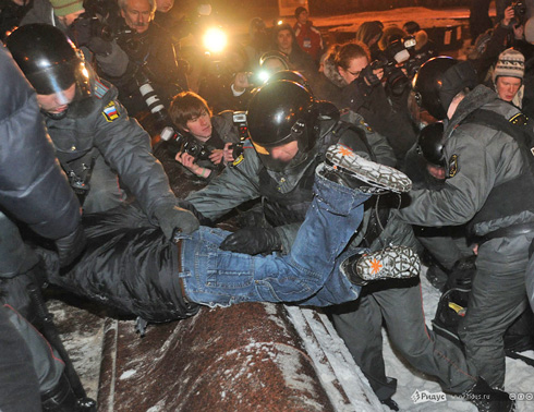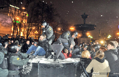 Большая часть собравшихся в итоге разошлась по домам, но около полутора тысяч человек предпочли задержаться. Удальцов, Пономарев, а также Илья Яшин из «Солидарности» и известный юрист Алексей Навальный забрались на чашу фонтана в центре площади с мегафоном и продолжили скандировать лозунги. Но затягивание оппозиционной акции не входило в планы московского ГУВД. Почти сразу фонтан окружили ОМОНовцы и начали отсекать слушателей, сдвигая их к метро. Затем сражение переместилось в фонтан, спецназовцы спустились на лед и принялись по одному задерживать оппозиционеров. Вокруг Удальцова, Навального и Яшина сплотилась группа сторонников, но с применением силы и дубинок их растащили. С задержаниями при этом особо не церемонились, а помощнику депутата Пономарева Алене Поповой даже сломали руку. «Что вы здесь стоите, бл..ди, все к метро», — орали бойцы на еще не задержанных оппозиционеров и журналистов. Когда лидеры оппозиции уже были в автозаках, оставшиеся на свободе активисты попытались продолжить акцию, перекрыли Тверскую улицу и двинулись к Триумфальной площади, но на полпути их догнали автобусы со спецназом и задержания продолжились. Всего в отделы полиции было доставлено около 400 человек.