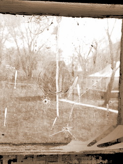 На фотографии мутное-мутное стекло, разводы белой краски и четыре отверстия от пуль, выпущенных из пневматического оружия пьяными посетителям «Карла Фридриха». За стеклом торчит бревенчатый сортир-избушка, принадлежащий пивному бару «Карл Фридрих». Сортир почти заслоняет храм XV века – церковь Варлаама Хутынского на Званице.