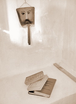 Это фотография, сделанная в мастерской Эдуарда Шарипова в 2009 году. Именно в этой мастерской теперь находится новая галерея. Тогда, почти три года назад, я фотографировал пулевые отверстия в окне его мастерской, под окнами которой расположился пивной бар.