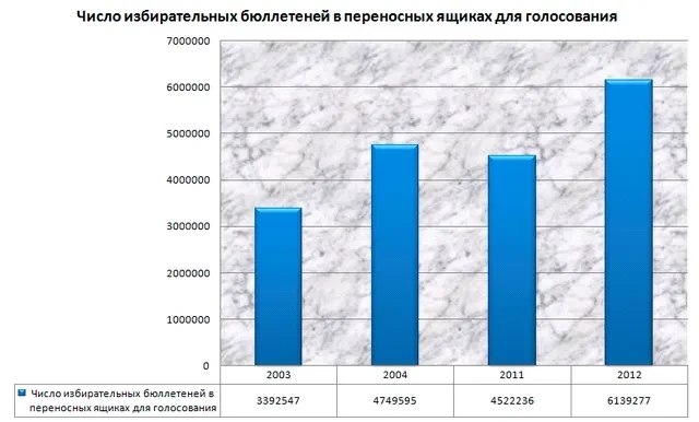 Члены УИК уже давно привыкли к «инициативным объездам» жилых кварталов с переносными урнами, чуть ли не стучась по квартирам и позволяя голосовать кому попало, оформляя это затем поддельными заявками. Зачастую делается и еще тупее: содержимое переносных ящиков элементарно заменяется на заранее отпечатанный «левый» тираж бюллетеней с заранее проставленными галочками напротив нужной графы. Поэтому можно уверенно предполагать, что почти на 100% переносные ящики дают результаты только в поддержку власти.