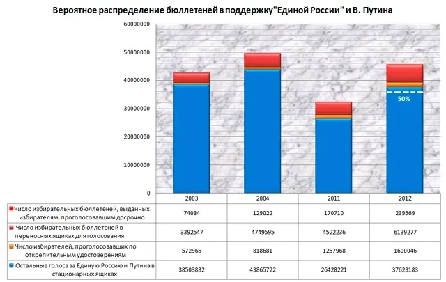50% голосов для победы в первом туре — это 35,8 млн человек, а Путин без переносных ящиков, без открепительных и досрочно проголосовавших «получил», насколько можно судить, только 37,6 млн — чуть более 52%.И если отнять от этих 52% «карусели», а также вбросы и переписывание итоговых протоколов (а вряд ли доля таких нарушений была меньше 2%) — можно с высокой долей вероятности предполагать, что Путин не смог набрать достаточного для победы в первом туре реального количества голосов.