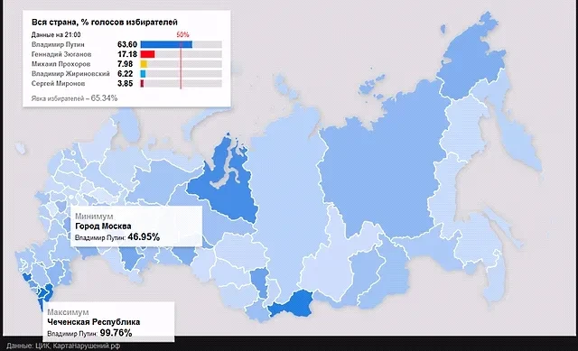 Наиболее близким к реальности уровнем его поддержки можно считать тот, что показала Москва. Аналитик Александр Киреев исследовал сложившуюся ситуацию и пришел к выводу, что Путин в Москве практически точно «попал в результат ЕР на думских выборах» — почти 47%, что идет вразрез с тенденциями во всех остальных регионах страны (там доля голосов в пользу Путина явно выше, чем в пользу ЕР тремя месяцами ранее). Особенно примечательны результаты в ЦАО — округе, самом оппозиционном по отношению к власти. Например, «на Арбате у Путина самое большое падение по сравнению с результатом «ЕдРа»… Было 63% за «Единую Россию», а стало 40% за Путина». Он уверен, что прослеживается четкая закономерность: Путин получил гораздо больше, чем «Единая Россия», прежде всего в тех районах, где стояли комплексы обработки избирательных бюллетеней (КОИБы). На думских выборах эти же КОИБы спасли данные участки от фальсификаций, что позволяет определить и реальные результаты ЕР по Москве в целом в декабре 2011 г. — 24—25% при явке 50%. Сейчас же стало 47% за Путина при явке почти 58%. Эта реалистичная картина полностью укладывается в то, что видно сейчас и по другим крупным городам. Таким образом, если пресс-секретарь Путина считает вопрос о признании президентских выборов закрытым — мы считаем не менее закрытым вопрос о признании парламентских выборов.
