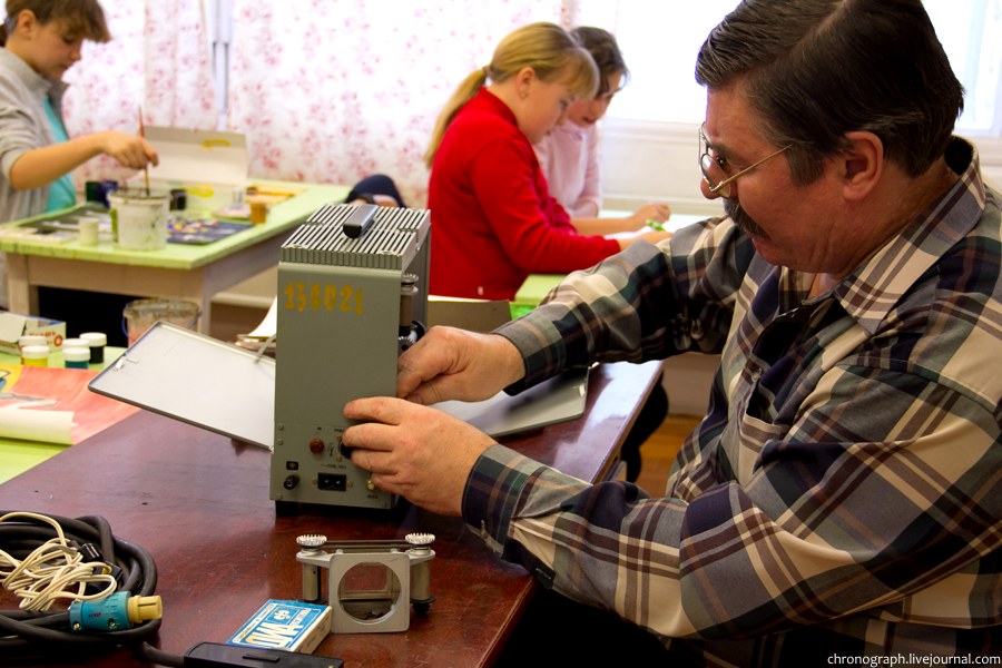 36. Преподаватель готовит проектор для диапозитивов.