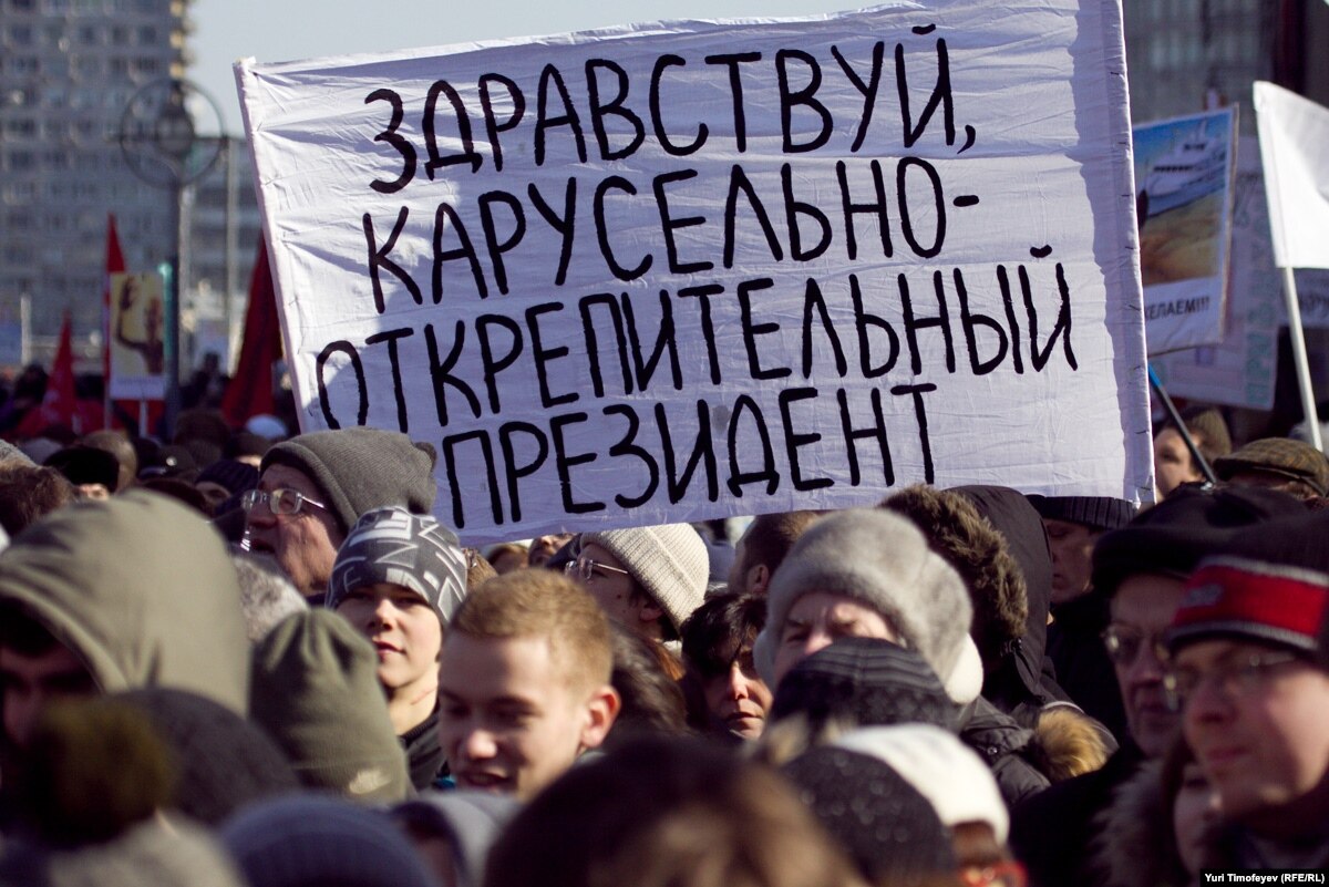 Митинг на Новом Арбате 10 марта 79% опрошенных Левада-Центром в феврале предполагали, что президентом России после выборов 4 марта станет Владимир Путин, о возможной победе всех остальных кандидатов говорили лишь 1-2 процента опрошенных. «Можете ли вы сказать, что хотели бы видеть на посту президента России любого политика, только не Путина?» - так звучал один из вопросов социологов. 38% респондентов на этот вопрос ответили «определенно да» или «скорее, да». Ответы «нет» и «скорее, нет» собрали 30% голосов. Через 6 лет, после выборов 2018 года, на президентском посту Владимира Путина хотели бы видеть 19% граждан, Дмитрия Медведева – 6%, а относительное большинство, четверть россиян, предпочли бы увидеть в этом качестве другого политика. Треть граждан отвечают: «там видно будет, буду думать об этом через 6 лет», 19% затрудняются с ответом. По поводу того, что будет происходить на президентских выборах общество разделилось пополам: 43% опрошенных предполагали, что это будет реальная борьба кандидатов, и 44% - что это будет лишь имитация борьбы, а распределение голосов на выборах будет определено по решению властей. Опросы проведены Левада-Центром за свой счет в период со 2 по 27 февраля. Всероссийская выборка 1600 человек. Статистическая погрешность данных – не более трех целых четырех десятых процента.