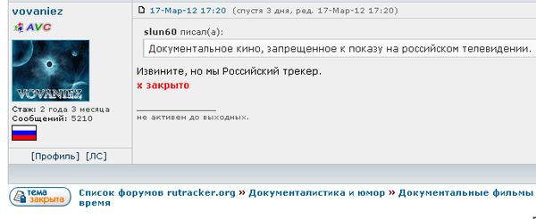 Потом (опять-таки, без объяснения причин) закрыли раздачу на Руторг.орг. Хотя... Вот это, наверное, можно считать объяснениями: