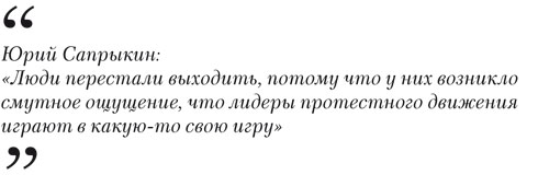 Сапрыкин: Главная опасность в том, чтобы борьба с одной узурпацией власти не превратилась, не казалась людям попыткой узурпации власти другой группой людей. Нужно, чтобы люди понимали и чувствовали, что есть широкая общественная сила, которая вообще-то многие проблемы может решать лучше, чем вертикаль власти. Это не значит, что она должна только чинить подъезды или только красить подъезды, она должна действовать на всех уровнях: от массовых акций в Москве до выборов в муниципальные советы Нижнего Тагила. Везде, единым фронтом, согласованными действиями. И постепенно, постепенно окажется, что дружить с этой общественной силой — это гораздо интереснее, и полезнее, и круче, чем вступать в партию «Единая Россия». Вот когда какой-нибудь будущий кандидат в мэры Ярославля будет фотографироваться с Навальным в обнимку, а не с Грызловым, вот тогда все и получится. А конкретные требования — это перевыборы в Государственную думу, после изменения избирательного законодательства, это выход на выборы в Мосгордуму и это, если уж избирательные законы будут изменены таким образом, как предлагается сейчас, это выборы мэра Москвы и Санкт-Петербурга. Это ближайший план.
