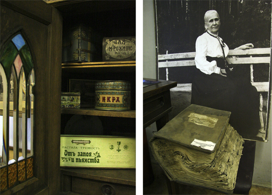 «Музей предпринимательства и меценатства»: содержимое купеческого буфета — икра и пастила «Трезвость», ассортиментный альбом суконных выклеек, 1874 год. Насколько развито чувство прекрасного у организаторов «музея мужицкого капитализма», можно понять из сравнения музейных залов с интерьерами первого этажа, который принадлежал до недавнего времени департаменту культуры. Эта госорганизация пыталась выселить музей и оставить все здание себе. Однако победил музей, которому явно не хватает места для показа постоянно расширяющейся коллекции. «Культурные» деятели, покидая здание, наняли роту солдат, которая на прощание разрушила в интерьере все, что было возможно. Колонна с перебитой серединой в первом зале перед входом смотрится так оригинально, что ее можно принять за экспонат выставки. Однако, пытаясь навредить другим, чиновники только явили собственную пошлость — за выдранными плитами навесного потолка стала видна благородная старинная лепнина, без панелей на стенах, изображающих дерево, стало намного приятней. На втором этаже интерьер сохранен — идея аккуратного евроремонта не показалась заманчивой работникам музея.