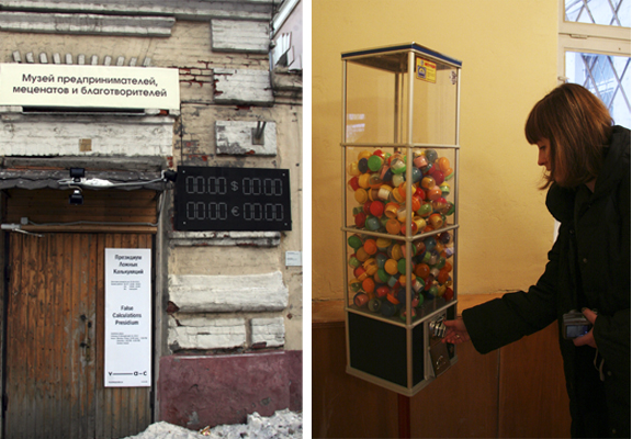 Николай Ридный «Zero» - электронное табло с курсами обмена валют высечено на гранитной плите; Иван Бражкин «Золотые слова» — всего за 5 рублей в этом автомате можно купить капсулу с мудрым изречением, взятым из различных философских трудов. Когда искусство так мощно становится частью повседневной жизни, творческим людям остается только одно — повнимательней присмотреться к реальности. Выставка «Президиум ложных калькуляций» (до 14 апреля) визуализирует экономические процессы. Она тоже сделана при поддержке фонда «Виктория», и также располагается в здании необычной и малоизвестной институции - Музее предпринимателей, меценатов и благотворителей. Идя по Донской улице, присматриваешься к зданиям впереди на нечетной стороне, и гадаешь, в какой из противных новых высоток найдешь этот музей.