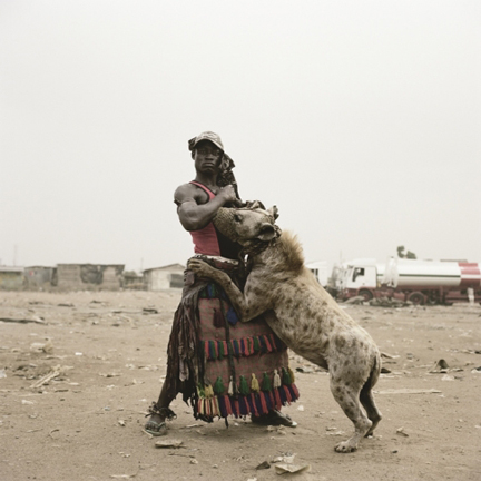 Питер Хьюго, «Абдуллахи Мохаммед и Майнасара. Оджере-Ремо, Нигерия», 2007. Из серии «Гиена и другие люди». На второй африканской фотосерии «Гиены и другие люди» Питера Хьюго (до 15 апреля) — укротители диких животных. Мастерство укротителя передается по наследству, семейный цирк ездит с представлениями по городам, зарабатывая за каждый показ до нескольких тысяч найра (1000 найра — примерно 6, 5 долларов США). Фотограф рассказывает о том, что, несмотря на популярность его серии в Европе, есть множество возмущенных откликов от защитников животных. Они не понимают, как можно быть такими жестокими с гиенами и обезьянами, но никого не волнует, как люди оказались в таких обстоятельствах, что проживая в Нигерии, шестой стране по объему экспорта нефти, не смогли найти для себя более выгодной и достойной работы.