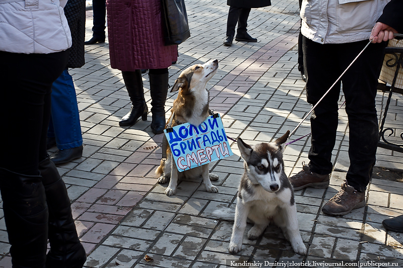 30 марта перед зданием администрации города Томска прошел пикет против убийства бездомных животных. Пикет был организован жителями дома по улице Крылова 14, во дворе которого работники Спецавтохозяйства убили четырех щенков на глазах жильцов.