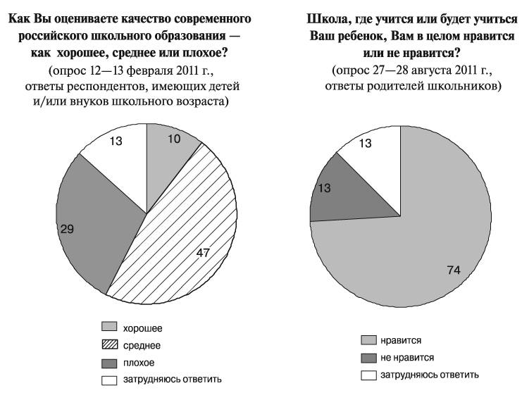 Графики, как нетрудно заметить, демонстрируют вопиющее противоречие. С одной стороны, наши граждане довольно сдержанно аттестуют российское среднее образование. С другой — три четверти родителей довольны школами, где обучаются их отпрыски. Причем даже в селах, где ситуация считается — и, видимо, небезосновательно — особенно неблагополучной, школы нравятся 69 % родителей, а не нравятся лишь 19 %. Впрочем, с ситуацией, когда какой-либо институт в общенациональном масштабе оценивается весьма низко, а его локальная «проекция», знакомая людям по собственному повседневному опыту, — гораздо выше, при изучении общественного мнения приходится сталкиваться нередко.