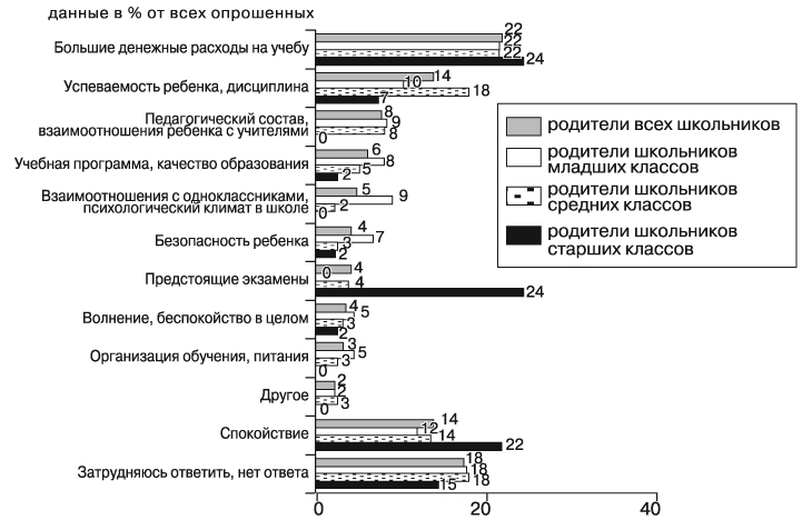 Подчеркнем, что по ответам родителей на открытый вопрос об их собственных тревогах ничего нельзя сказать о степени их обеспокоенности: сама постановка вопроса предполагает, что обеспокоенность имеется, и по сути требует от респондента лишь указать ее причины.
