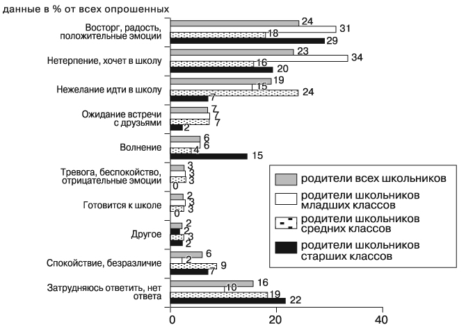Судя по ответам родителей, большинство детей перед началом нового учебного года пребывают в состоянии радостного предвкушения, а не уныния. Представленная ниже гистограмма — результат обработки ответов на открытый вопрос (они давались в свободной форме и потом отдельные высказывания группировались по смыслу).