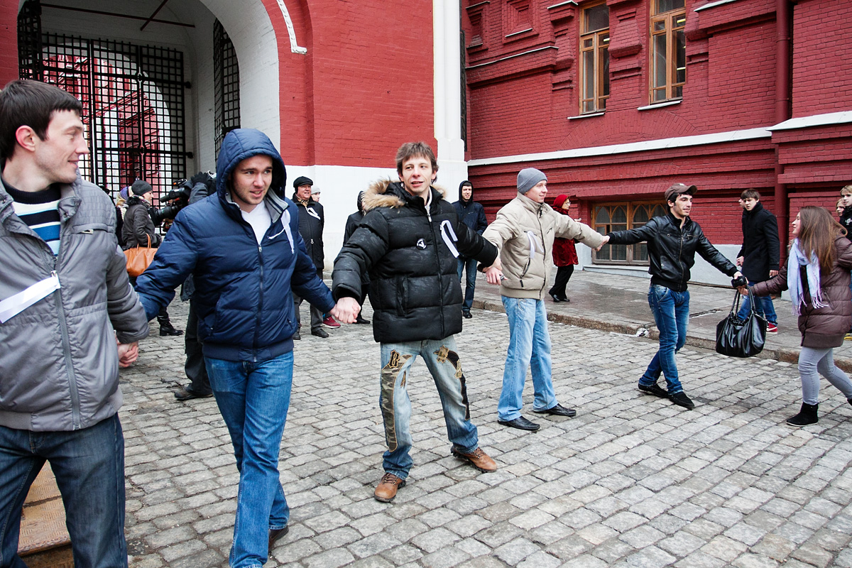 Участники одного из сообществ в социальной сети "Фейсбук" планировали провести в воскресенье массовый флэш-моб, который предполагал, что в течение дня по Красной площади будут прогуливаться люди с белыми лентами – символом движения "За честные выборы". Однако сделать им этого не удалось. Все входы на площадь были ограждены металлическими барьерами.