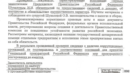 "В результате проведенной проверки сведения о наличии коррупционных проявлений не подтвердились, — говорится в официальном ответе департамента Генпрокуратуры по борьбе с коррупцией, имеющемся в распоряжении Русской службы Би-би-си. — Оснований для принятия Генпрокуратурой мер прокурорского реагирования не имеется".