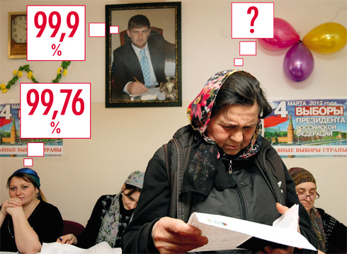 Особая явка По словам специалиста по выборам Александра Кынева, реальная явка на Северном Кавказе, в частности в Чечне, составила 30–40% вместо заявленных 99%. Собеседники The New Times, бывшие свидетелями голосования, подтверждают: люди на участки шли неохотно. «Люди на Кавказе проигнорировали эти выборы», — считает шеф-редактор независимого кавказского журнала «Дош» Абдулла Дудуев. Еще 4 декабря во время парламентских выборов Дудуев с коллегами проехался по участкам: «Стартовали в Ингушетии на участках в Карабулаке и Назрани и через чеченские Грозный и Аргун доехали до Дагестана, где заглянули на участки в Хасавюрте и Махачкале. Нигде мы не видели больше 10–15 человек одновременно». В марте картина повторилась, хотя, по словам Дудуева, людей на участки пытались затащить всеми возможными способами: агитировали в мечетях, учебных заведениях, госучреждениях, везде людям говорили, что надо прийти и проголосовать за Владимира Путина. «В некоторых населенных пунктах главы администраций говорили жителям, что от каждой семьи должен прийти хотя бы один человек и проголосовать за всех домашних, — говорит Дудуев. — Члены комиссий нам так говорили: нужный результат будет получен независимо от явки и погоды». Эдуард Атаев, бывший наблюдателем от «Яблока» на парламентских выборах и членом комиссии с правом совещательного голоса на президентских на участке 1561 в родном селе Эндирей Хасавюртовского района Дагестана, подтверждает: явка была низкая. На выборах депутатов Госдумы на участке Атаева, по его подсчетам, проголосовали 65 человек, что не помешало сначала провести вброс и записать «Единой России» суммарно 128 голосов, а затем, уже после того как наблюдателей выгнали с участка, набросить и вписать в финальный протокол еще 949 голосов за партию власти. На президентских же выборах в соседнем с 1561-м участком помещении сидели социальные работники, каждый из них должен был привести на выборы 20 человек. «У них были специальные проштампованные листочки, куда они записывали номера приведенных ими людей в избирательных списках», — говорит Атаев. По словам его коллеги, работавшего в чеченском УИКе, ситуация доходила до абсурда: «Выплаты пособий по инвалидности, зарплаты и стипендии перенесли на 4 марта: проголосовал в одном помещении, получил причитающееся в соседнем. Очень удобно, и к тому же есть стимул для голосования». Бывший пресс-секретарь президента Ингушетии Юнус-Бека Евкурова Калой Ахильгов в разговоре с The New Times напомнил, как после думских выборов 2007 года, в которых, по данным ЦИК, приняли участие 99% жителей, в республике была организована акция «Я не голосовал!». Ее организаторам удалось собрать подписи более 85 тыс. ингушей, это примерно 55% избирателей республики, которые заявили, что не ходили на участки. К пересмотру итогов выборов акция не привела, а один из ее организаторов, правозащитник и юрист Магомед Евлоев, в августе 2008 года был убит сотрудниками МВД по дороге из аэропорта Назрани.
