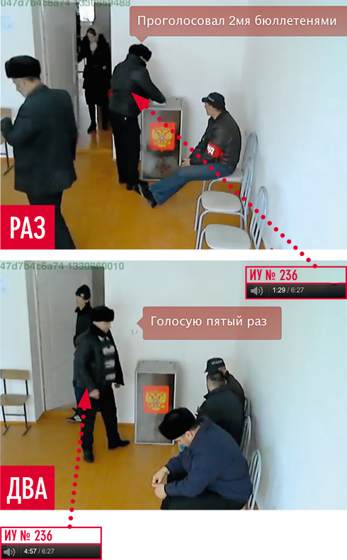 «В Грозном мы общались с людьми, которые жаловались, что они уже проголосовали на нескольких участках и еще нужно обойти десяток-другой», — рассказывает Абдулла Дудуев. На роликах видно, как один и тот же человек может проголосовать много раз, и это не удивляет никого из членов комиссий. «Мы тоже такое видели — люди переодевались, надевали другие шапки или тюбетейки и шли голосовать снова», — подтверждает Дудуев. Самый пока известный ролик на эту тему в YouTube называется «Карусель по-чеченски: фальсификация явки на выборах». Ролик снят на участке № 236 в селе Ножай-Юрт Ножай-Юртовского района Чечни, и на нем видно, как мужчина в полосатом свитере и черной кожаной куртке голосует шесть раз по разным паспортам.
