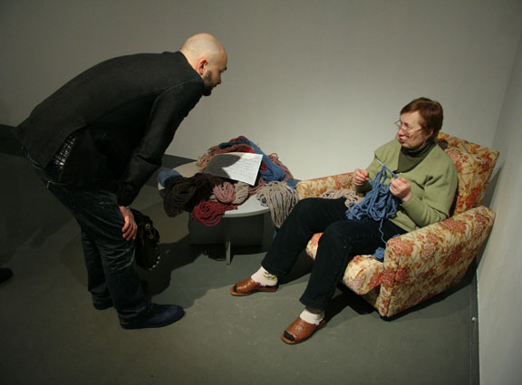 «Вязание на спицах и крючком множества Мандельброта», группа «Куда бегут собаки»Все же, среди номинированных кураторских проектов есть две попытки преодолеть изолированность искусства от зрителя: «Аудитория Москва. Эскиз публичного пространства» Екатерины Деготь, Давида Рифа, Иоанны Мытковской, проект, в котором зрителю предлагали не зрелище, некий продукт чьей-то работы, но очень насыщенную программу дискуссий об искусстве и политике с участием авторов работ; и проект «Спальный район. Открытый урок» Марины Звягинцевой и Юрия Самодурова - 200 произведений лучших российских современных художников, выставленные в общеобразовательной школе. Но премию получил Виктор Мизиано с несомненно важной и достойной выставкой «Невозможное сообщество» - но она скорее проблематизирует невозможность диалога искусства с обществом, в то время как уже есть люди, которые пытаются эту проблему решать.