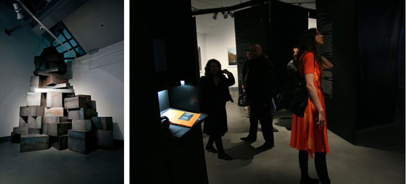 Сложно-смешанная техника исполнения произведений заслуживает отдельного внимания. Есть картины лаковые в технике монгольского лука из прессованных жил и дерева, и картины на войлоке – между Бойсом и валенком. Картины на плитах из яичной скорлупы, по технологии изготовления китайских шкатулок – это дает поверхность с трещинками кракелюрами, патину времени, которую так любят для солидности и достоверности наводить на подделки старинной живописи в худсалонах. Этикетки к работам, где рядом упомянуты нанотехнологичная УФ-отверждаемая печать и бычья желчь – воистину душа нашей страны, где разговоры о модернизации сочетаются со средневековым сознанием. К арсеналу зелий оккультной целительницы с вкраплением технологий будущего добавили 3D видео пейзажей и штандарты будущей Евразии. Однако непонятно, зачем так колдовать, если эта евразийская эклектика с нами уже случилась, пусть и не в такой героической форме.
