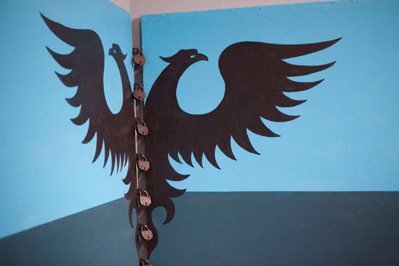 Андрей Филлипов, из проекта "Веерное отключение". Фото: aroundart.ruГосударственная символика на ней сочетается с макабрической, атрибуты светской жизни повествуют о духовном. Двухглавый орел – наполовину призрак, одна половина геральдического зверя материальна, вторая – лишь ее тень. На четырех штандартах для четырех всадников Апокалиписа – стихи на эсхатологическую тему. Из СD-дисков на стене выложена аббревиатура «CD», отсылающая к латинскому Civitus Dei, «град божий». В этом сопоставлении есть ощущение того, что виртуальная, цифровая реальность более долговечна и желанна, чем бренная плоть. Все великие свершения человечества имеют свой конец – и семь вееров с изображением ночного неба схлопываются по цепочке и становятся видны подсвечивающие их плафоны с изображениями руки ангела, держащей свиток. Но пока конец света не наступил, и империя держится – двухглавый орел написан художником на двух холстах, и половинки держатся вместе на «семи печатях», ржавых амбарных замках.